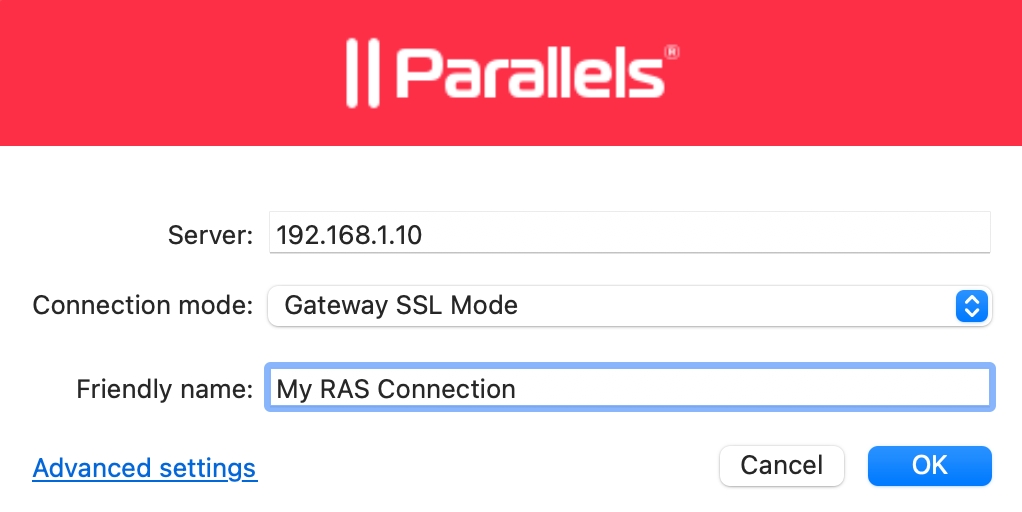 Gateway Mode. Parallels Client connects to the RAS Secure Gateway and the session connection is tunneled through the first available connection. This mode is ideal for servers that are only reachable via the gateway and do not require a high level of security.