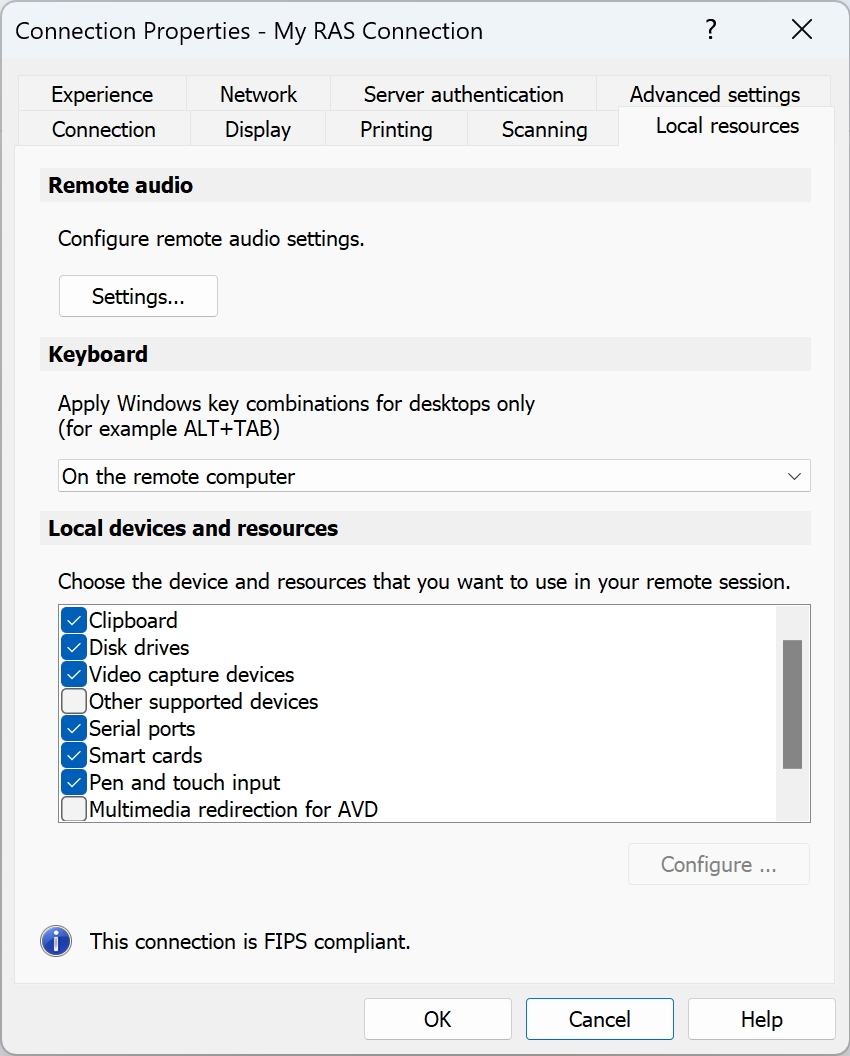 Use the Local resources tab page to configure how local resources are used in a remote session.
