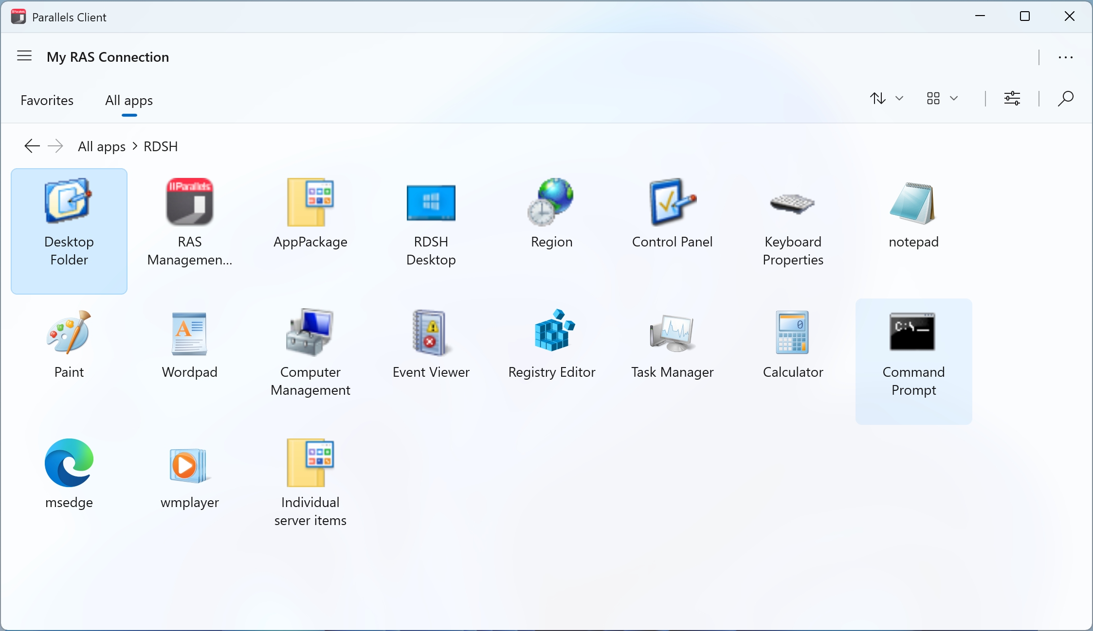 You should now see the main Parallels Client window. The left pane of the window displays the connection that was automatically configured for you. The right pane displays published resources that you can use.