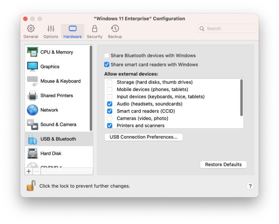 When configuring USB device settings for a virtual machine, you can enforce what types of USB devices are allowed to be connected. For example, if storage devices (in general) are not allowed, the Mac user will not be able to connect an external hard disk or thumb drive to the virtual machine. This functionality is available in Parallels Desktop Business/Enterprise edition only and is absent in other editions.