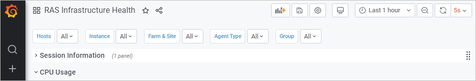 Standardmäßig wird das Dashboard im Kioskmodus geöffnet. Um das Dashboard zu verlassen, drücken Sie Esc“. Um den Ansichtsmodus zu wechseln, klicken Sie auf das Monitor“-Symbol oben rechts. Wenn Sie den Kioskmodus beenden, wird die Seite RAS-Infrastruktur-Systemzustand angezeigt: