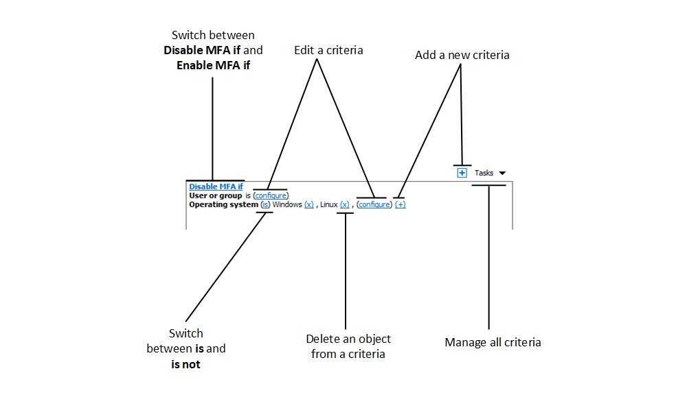 Multi-factor authentication (MFA) can be enabled or disabled for all user connections, but you can configure more complex rules for specific connections. This functionality allows you to enable or disable MFA for the same user, depending on where the user is connecting from and from which device. Each MFA provider has one rule that consists of one or several criteria for matching against user connections. In turn, each criteria consists of one or several specific objects that can be matched.