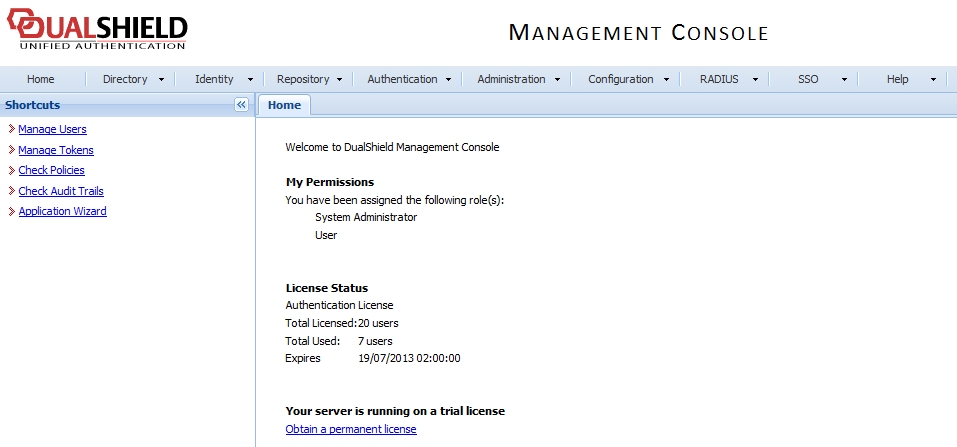 Login in to the DualShield Management Console with the default credentials (User: sa, Password: sa). You will be prompted to change the default password.