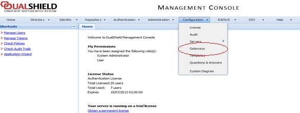 After you have configured the application you need to configure an Email or SMS gateway which are used by DualShield server to communicate with the end user. In this document we will be using an Email gateway. Select Gateways from the Configuration menu.