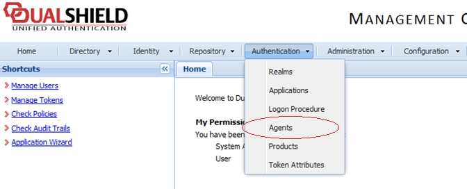 Go back to the DualShield Management Console and select Agents from the Authentication menu as shown below.