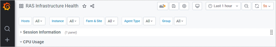 By default, the dashboard opens in kiosk mode. To exist it, press "Esc". To cycle view mode, click the "monitor" icon in the upper right. When you exist kiosk mode, the RAS Infrastructure Health page is displayed: