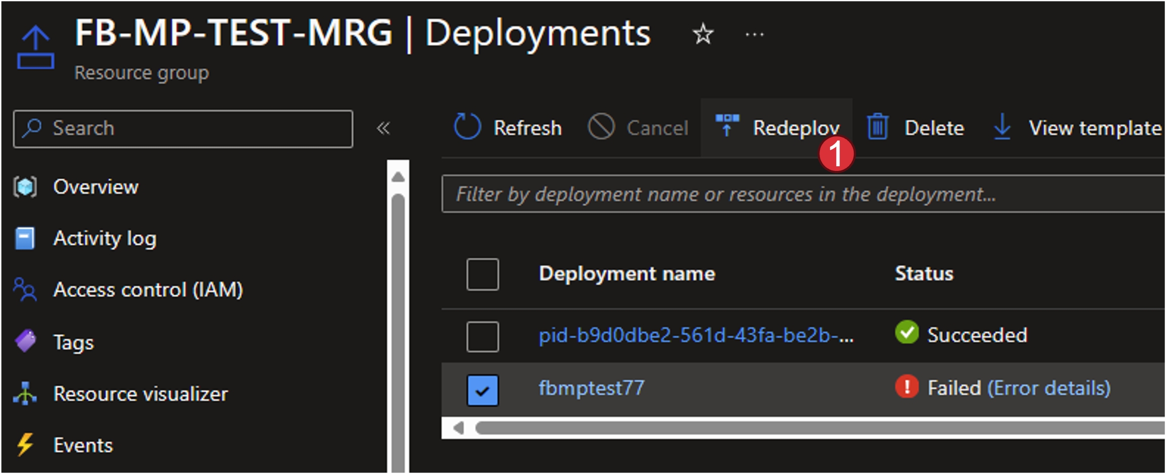 Open the Resource Group where the Managed Application was deployed. Then, open the deployment history. Click on the Managed Application that failed and then click Redeploy.