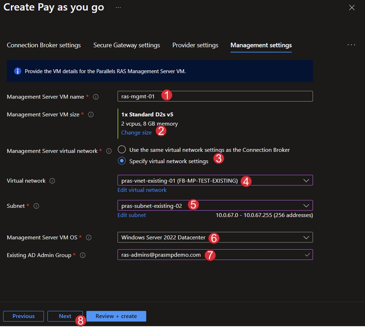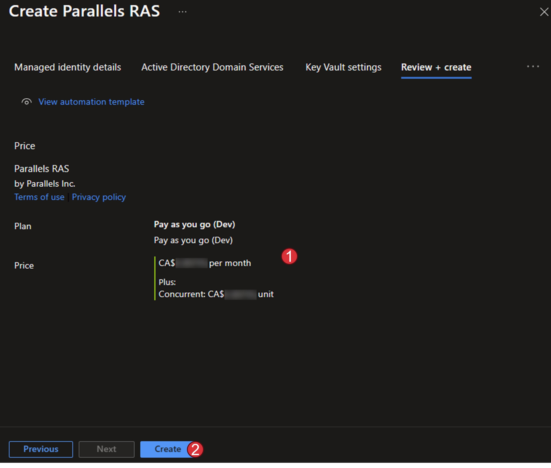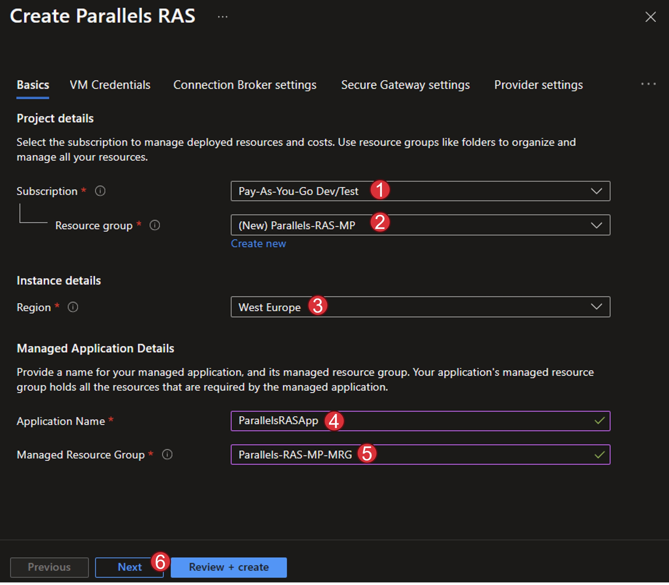 ParallelsRASApp. This name needs to be unique.Select the name of the resource group for Parallels RAS infrastructure resources. The Azure Marketplace requires this to be a new Resource group.