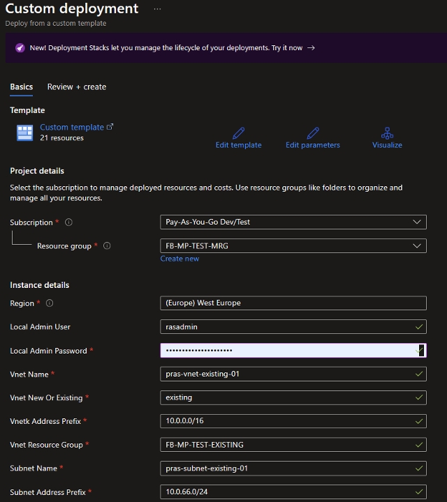 In this case, you will see a slightly different deployment experience. All previously provided parameters are shown in a single view, except for secure values. You can fix the errors and redeploy again.