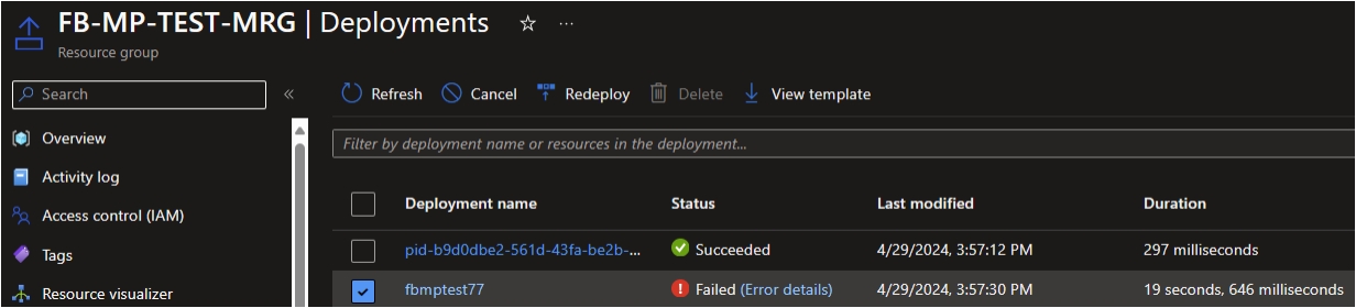 In those cases, more details can be obtained by looking at the deployment history of the Managed Resource Group.