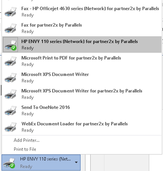 When the printers are properly mapped, they will appear on the client side as "%PRINTERNAME% for %USERNAME% by Parallels".