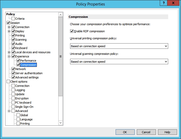 In the Policy Properties dialog, navigate to Session > Experience > Compression.
