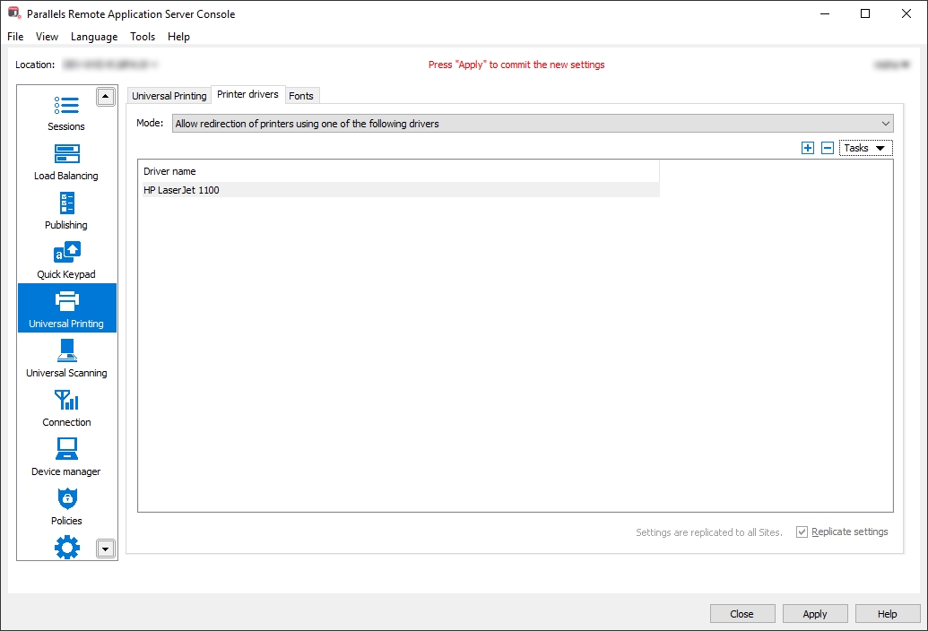 Microsoft Spooler Service may become unstable if the terminal server has a very large number of printer drivers installed. Although RAS Universal Printing has no limitations regarding printer types, it is important to protect the terminal servers from printer driver sprawling. In order to mitigate this issue, Parallels RAS Universal Printing includes the printer driver exclusion feature to filter out printer devices that are not needed.