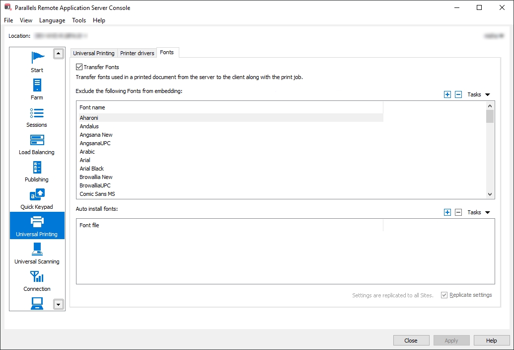 Exclude standard operating system fonts (Arial, Times New Roman, etc.). Also exclude fonts that are already present on RD Session Hosts according to the Fonts Management settings in the RAS console. To view and modify the settings, open the RAS console and navigate to Universal Printing > Fonts.