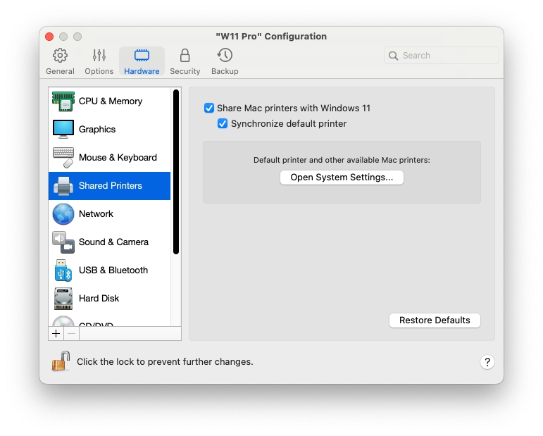 Im Bereich Freigegebene Drucker können Sie den Mac-Drucker für die virtuelle Maschine freigeben, den Standarddrucker synchronisieren und vieles mehr.