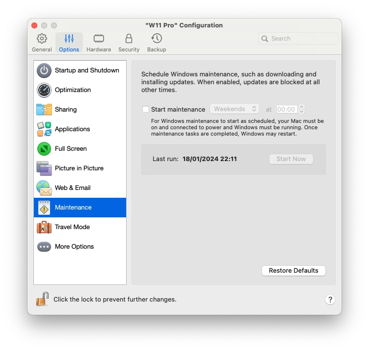 Um diese Einstellungen zu öffnen, wählen Sie Aktionen > Konfigurieren > Optionen und klicken Sie dann auf Wartung.