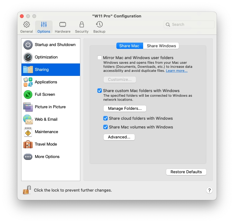 Vous pouvez configurer Parallels Desktop pour qu'il monte automatiquement les volumes et périphériques de stockage dans Windows. De cette manière, vous pouvez accéder aux contenus de macOS et de Windows.