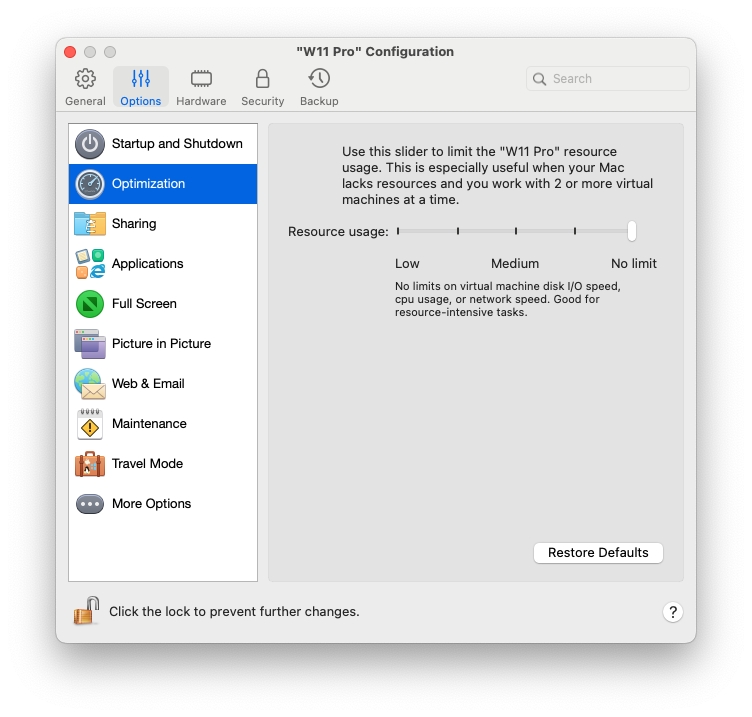 Se il Mac non dispone di risorse per l'esecuzione di due o più macchine virtuali alla volta, puoi limitare l'utilizzo delle risorse in modo che la macchina virtuale che svolge le operazioni più importanti abbia più risorse. Trascina il dispositivo di scorrimento tra i punti Basso, Medio e Nessun limite. Se modifichi questa impostazione e poi non sei soddisfatto delle prestazioni di Windows, prova un'impostazione diversa.