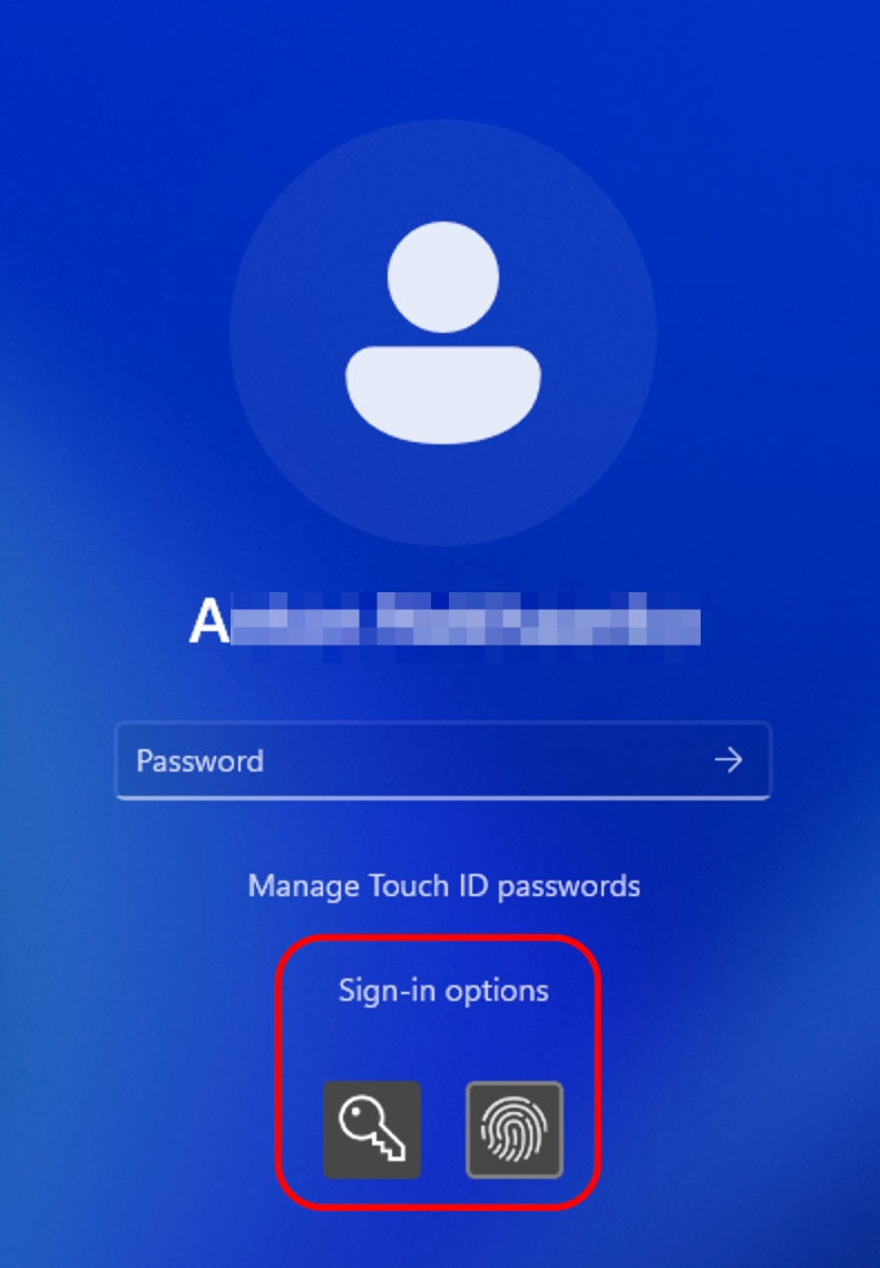 Una volta soddisfatti tutti i requisiti, al successivo avvio del computer Windows ti verrà chiesto di immettere la tua password sulla schermata di accesso per consentire l'accesso con il Touch ID. Una volta eseguita questa operazione, sulla schermata di accesso verrà visualizzata una notifica a comparsa "Touch ID per accedere come {nome_utente}". Utilizza il Touch ID per sbloccare Windows. Se non visualizzi questa notifica, scegli Opzioni di accesso e seleziona il pulsante sullo schermo con il simbolo dell'impronta digitale.
