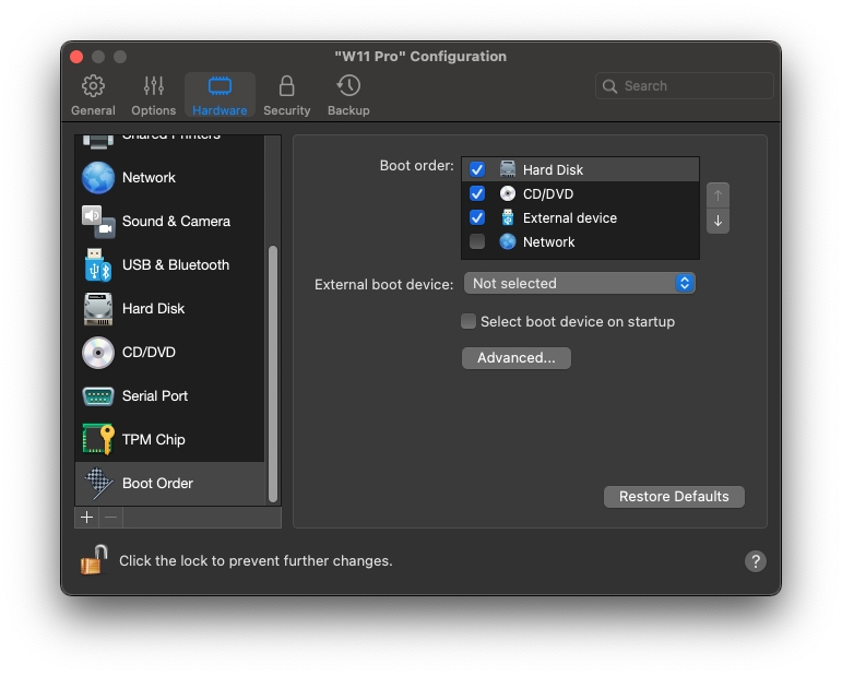 在启动顺序窗格,您可以查看和配置虚拟机的启动顺序列,即虚拟机尝试从不同的启动设备加载操作系统的顺序。