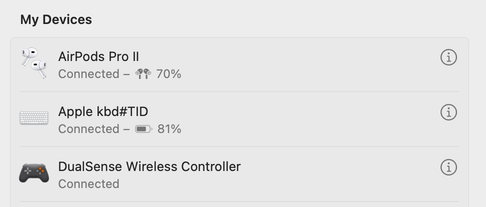 將控制器連線到您的 Mac。它應該會顯示在「系統設定」>「藍牙」中的「已連線」裝置清單下;