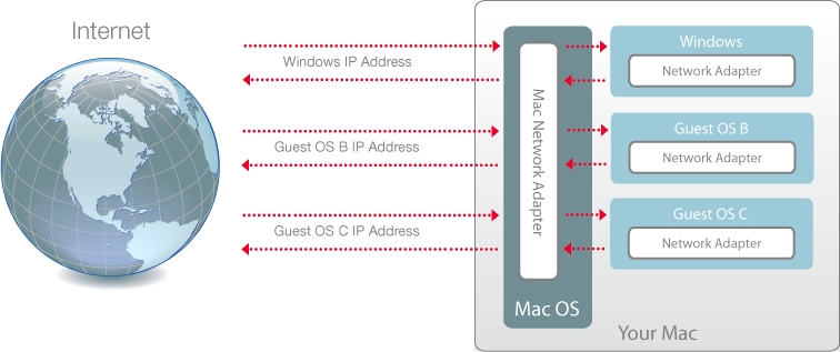 Im Bridged-Ethernet-Modus erscheint Windows im Netzwerk als eigenständiger Computer mit eigener IP-Adresse und eigenem Netzwerknamen.