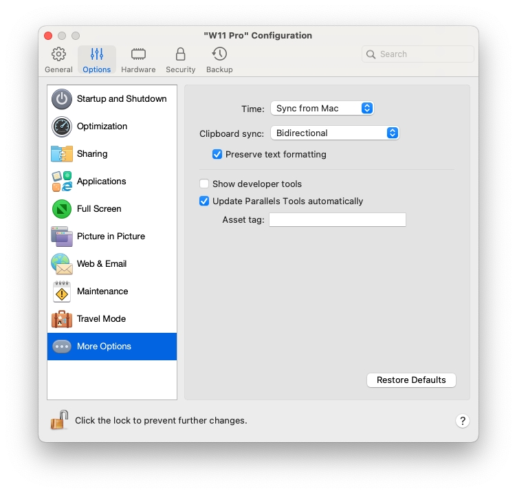 Les étiquettes d'inventaire permettent d'identifier, de contrôler et suivre les actifs informatiques d'une organisation. Parallels Desktop permet de définir une étiquette d'inventaire dans le BIOS de la machine virtuelle qui peut ensuite être lue à l'aide des outils standard du système d'exploitation client. Pour définir une étiquette d'inventaire, saisissez l'étiquette souhaitée dans le champ correspondant.