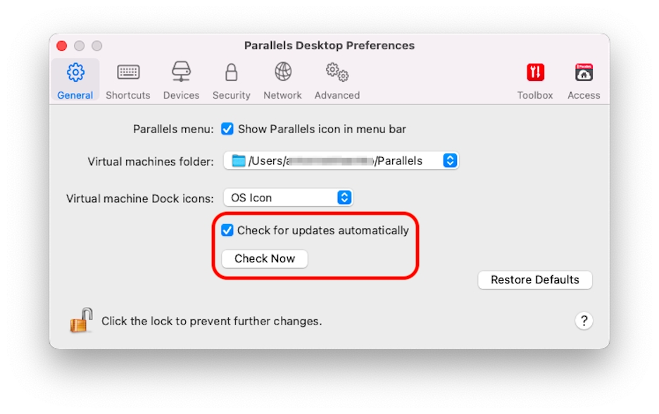 Per scegliere se Parallels Desktop deve scaricare gli aggiornamenti automaticamente, seleziona o deseleziona Scarica aggiornamenti automaticamente.