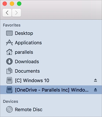 次に、Windows ディスクを macOS デスクトップにマウントする必要があります。Finder で、仮想マシンをクリックします。仮想マシンは、[共有] セクションでアクセスできます。仮想マシンが実行中である必要があります。 任意の Windows ディスクをダブルクリックします。ディスクがマウントされて、デスクトップに表示されます。