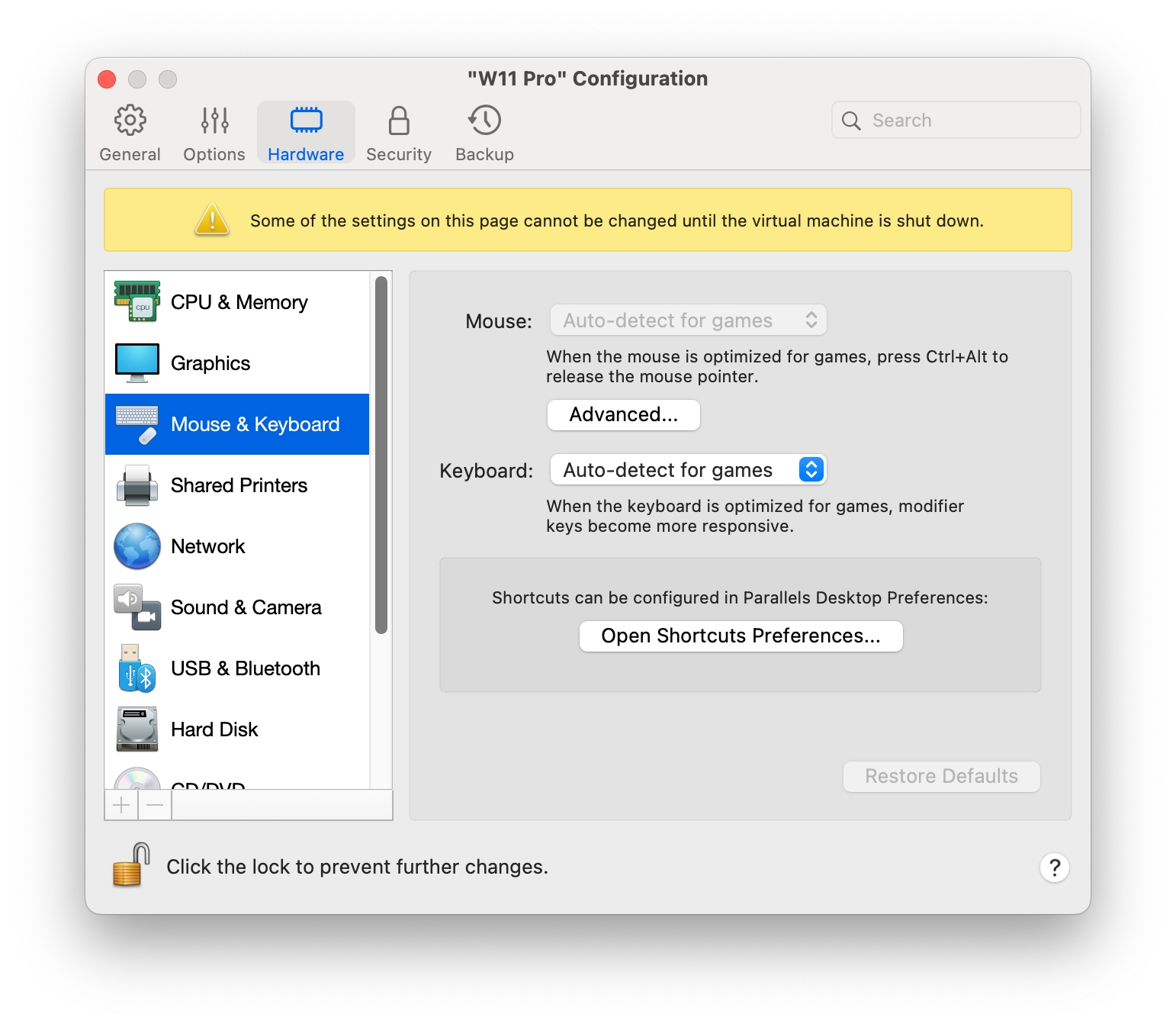 [ゲームに最適化する]: ゲームのプレイ中に誤ってマウスが macOS に移動される心配がある場合は、このオプションを選択すると、マウスが仮想マシン内でのみ機能するようになります。