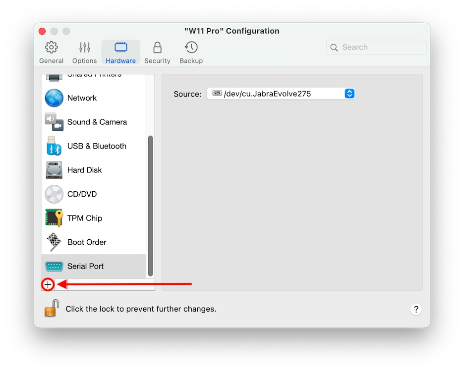 若要開啟這些設定,請選擇「動作」>「設定」>「硬體」,然後按一下「序列埠」。若沒有序列埠,請按一下 + 新增,並依循下列指示進行設定。