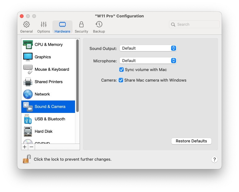 Im Bereich Audio und Kamera können Sie die Parameter für das Soundgerät der virtuellen Maschine anzeigen und konfigurieren und die Kamera des Mac für die virtuelle Maschine freigeben.