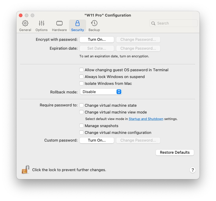 Sie können auf der Registerkarte Sicherheit der Konfiguration der virtuellen Maschine die virtuelle Maschine vom Mac trennen, wählen, ob Sie die Änderungen während der Arbeit mit der virtuellen Maschine speichern oder verwerfen möchten, Passwortanforderungen für bestimmte Aufgaben festlegen und mehr.