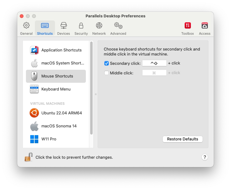Standardmäßig ist Parallels Desktop so eingestellt, dass die Tastenkombination Umschalt+Strg in Verbindung mit der Maustaste einen rechten Mausklick simuliert. Sie können die Tastenkombination für die Simulation des rechten Mausklicks ändern.