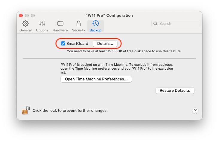 Time Machine, cuando realiza copias de seguridad de su Mac, realizará una copia de seguridad de su máquina virtual y de estas tres instantáneas. Este le permite reducir la cantidad de datos que deben ser copiados por Time Machine, reducir el tiempo necesario para que Time Machine realice la copia de seguridad de los disco duros virtuales y minimizar el riesgo de pérdida o corrupción de datos cuando se restauren los discos duros de la máquina virtual a partir de la copia de seguridad de Time Machine.