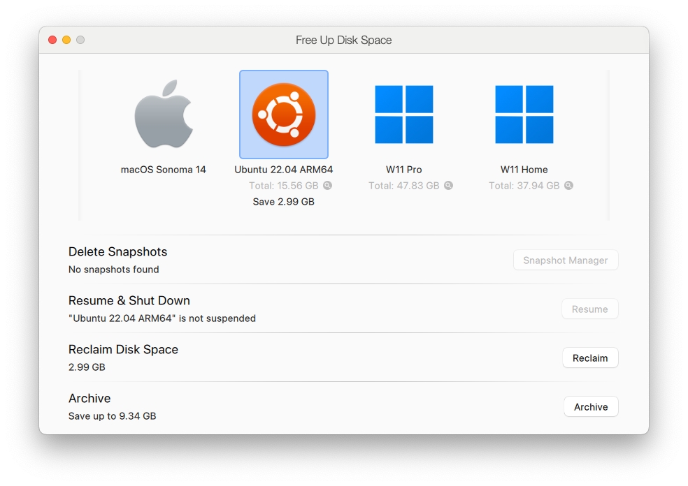 Gracias al asistente de liberación de espacio en disco, puede comprimir el/los disco(s) duro(s) de la máquina virtual y eliminar archivos innecesarios para así disponer de más espacio en disco.
