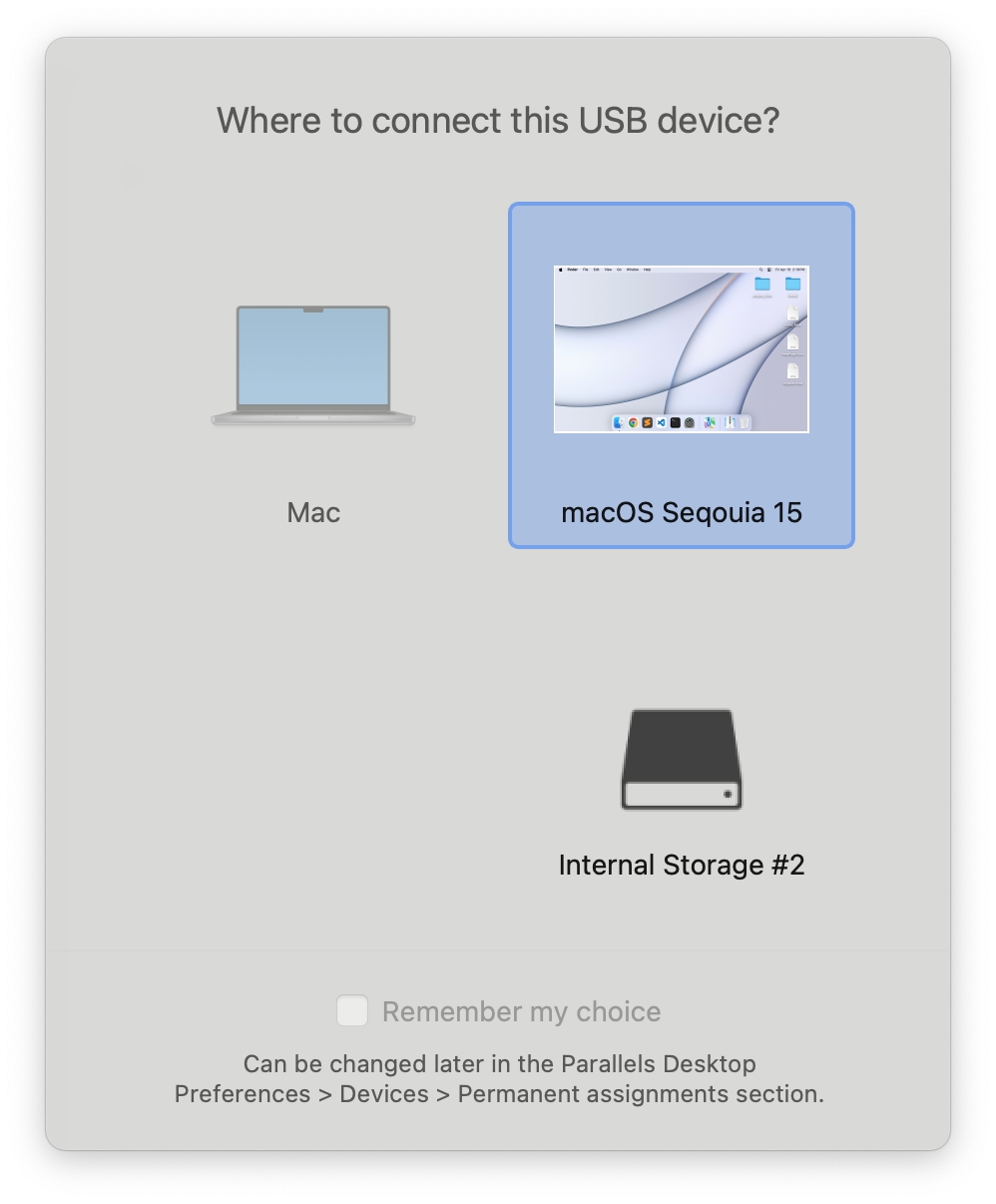 Asegúrese de que las preferencias de dispositivos de Parallels Desktop estén configuradas en Preguntarme qué hacer.