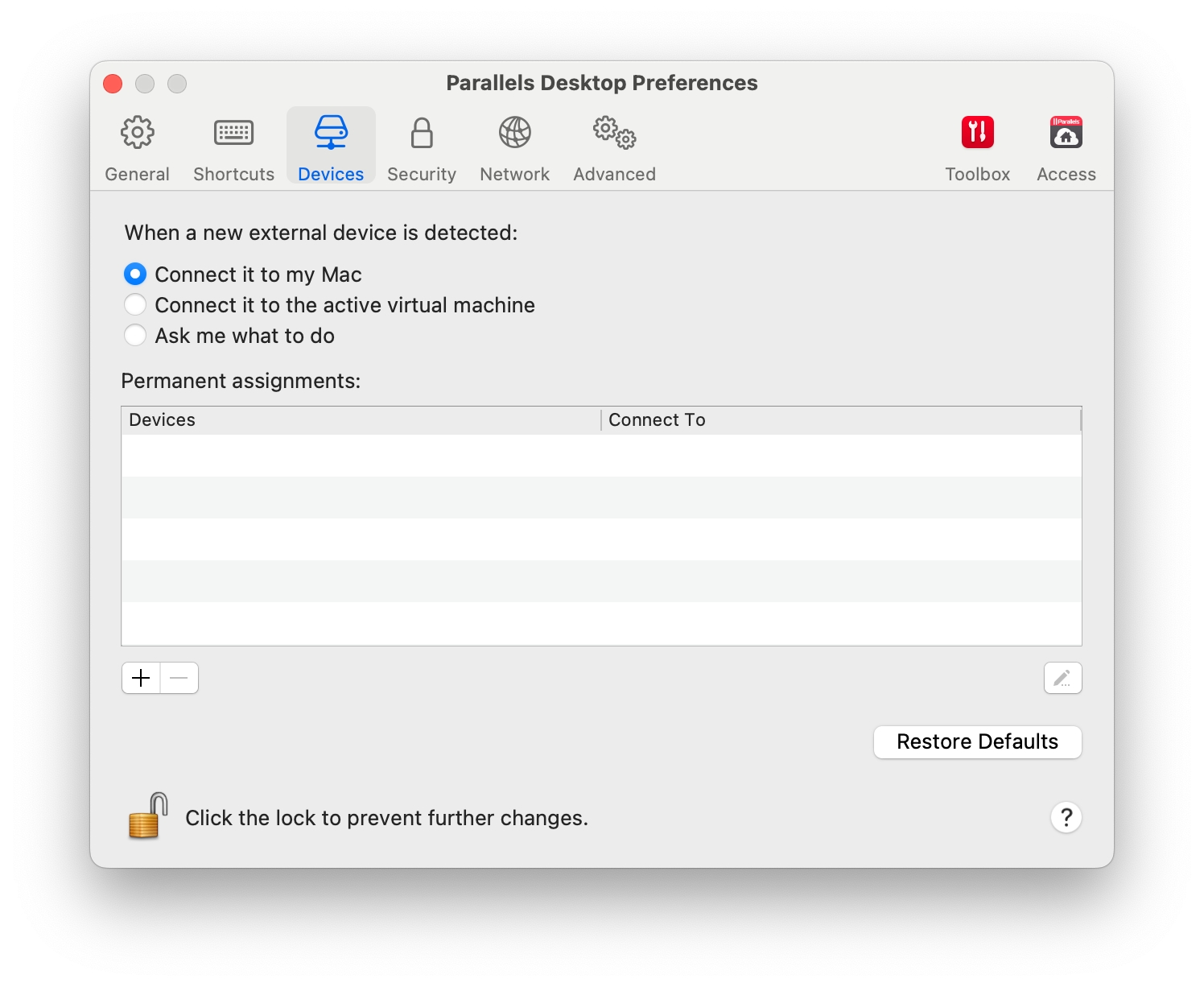 Nel riquadro Dispositivi nelle Preferenze di Parallels Desktop, è possibile: