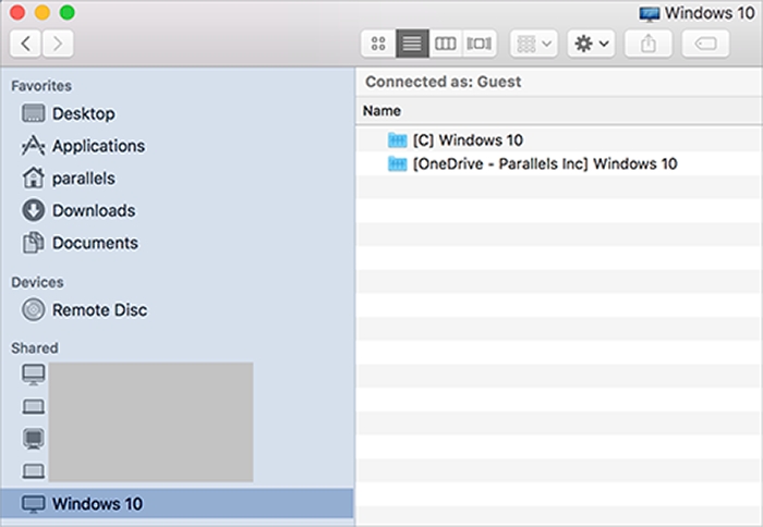 Finder を開いて、[共有] セクションで仮想マシンをクリックします。仮想マシンが実行中である必要があります。 注: macOS 10.14 Mojave 以降では、仮想マシンが [ネットワーク] セクションにあります。
