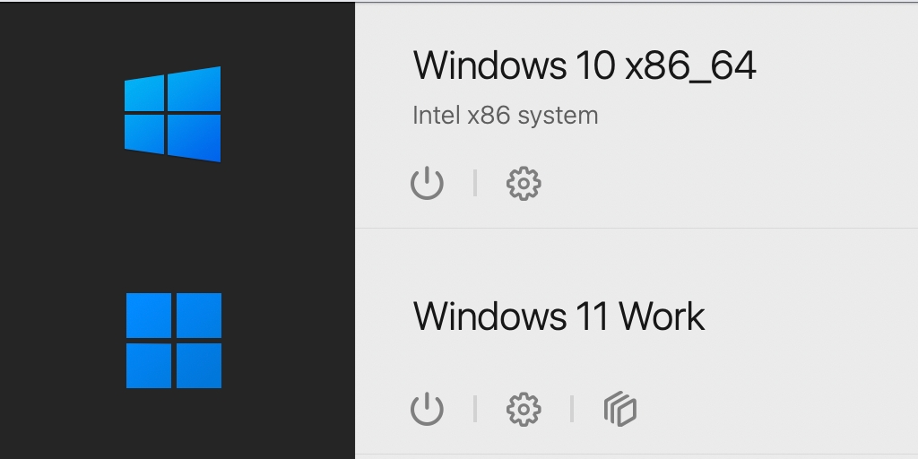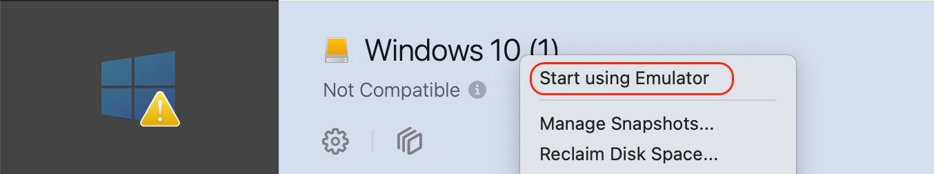 .pvmファイルを Apple Silicon Mac の Parallels Desktop 仮想マシンが保存されているフォルダにコピーし、右クリックして、「プログラムから開く」>「Parallels Desktop」の順に選択します。インポートした仮想マシンは、コントロールセンターで最初は「非互換」と表示されます。右クリックして、「エミュレータの使用を開始」オプションを選択します。