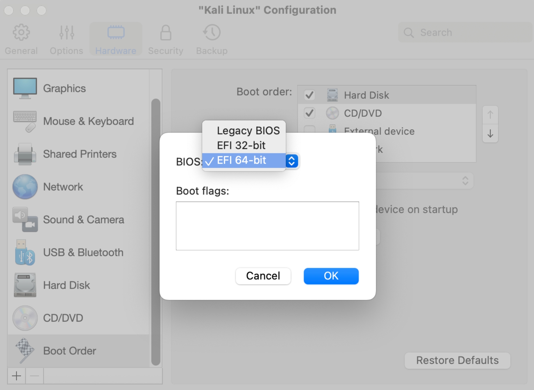 Intel Macで作成されたLinux仮想マシンのほとんどは、レガシーBIOSをエミュレートする仮想ブートローダーを使用しており、これは当社のエミュレーション機能と互換性がありません。Linux x86_64マシンを転送する場合は、まずIntel Mac上で新しいマシンを作成する必要があります。以下の手順に従ってください。