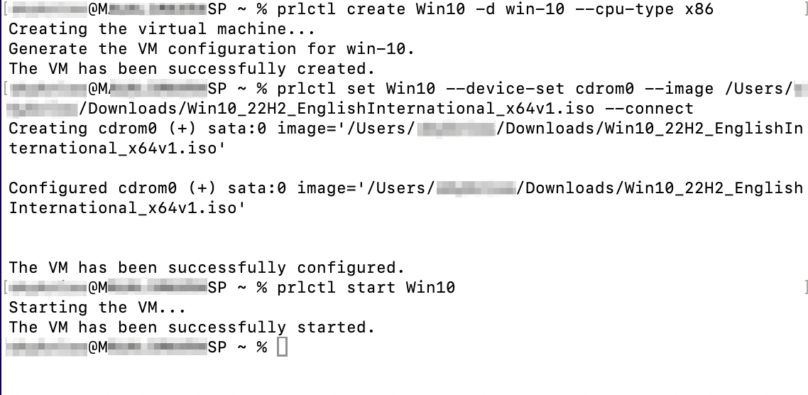 macOSのターミナルを起動し、以下のコマンドを実行します。 > prlctl create <vm_name> -d <distro> --cpu-type x86 > prlctl set <vm_name> --device-set cdrom0 --image <x86_iso_path> --connect > prlctl start <vm_name>