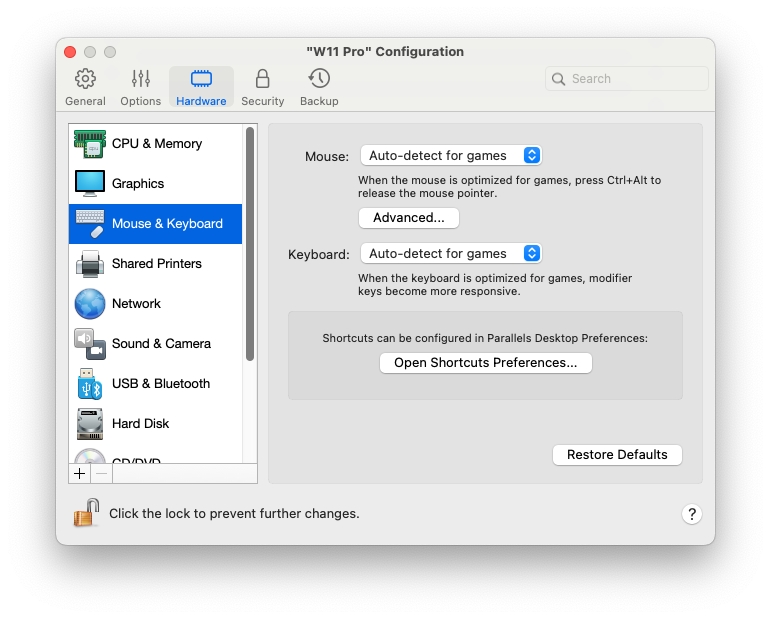[ゲームに最適化する]: ゲームのプレイ中に誤ってマウスが macOS に移動される心配がある場合は、このオプションを選択すると、マウスが仮想マシン内でのみ機能するようになります。マウスの入力を解放して macOS に切り替えるには、Ctrl + Alt キーを押します。