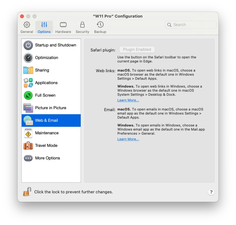 [ウェブとメール] ペインで、Microsoft Edge で Web ページを開くための Safari のプラグインを有効化できます。また、Windows で開いたリンクやメールを macOS の Web ブラウザーやメールアプリで常に開くように設定する方法や、その逆の方法もご確認いただけます。