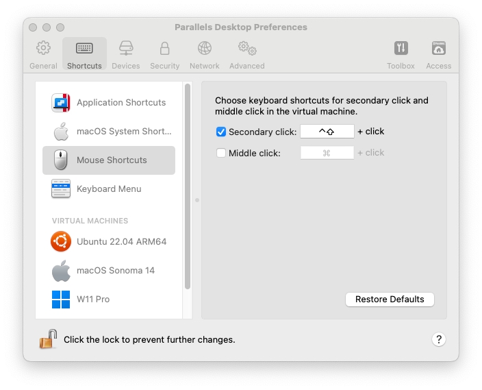 Windows 中的許多工,例如帶出快顯功能表,都要靠按一下滑鼠右鍵完成。在預設情況下,Parallels Desktop 設定為當您按下 Shift+Control 並按一下滑鼠時類比右鍵按一下。您可以變更觸發按一下滑鼠右鍵的按鍵組合。進行以下操作: